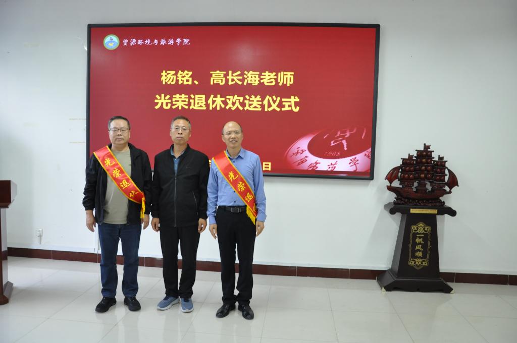 9月19日下午,资源环境与旅游学院为杨铭老师、高长海老师隆重举行光荣退休欢送仪式。离退休职工工作处党委书记王勇应邀出席,学院领导班子及全体教职工共同参与。仪式由院党委书记何方主持。