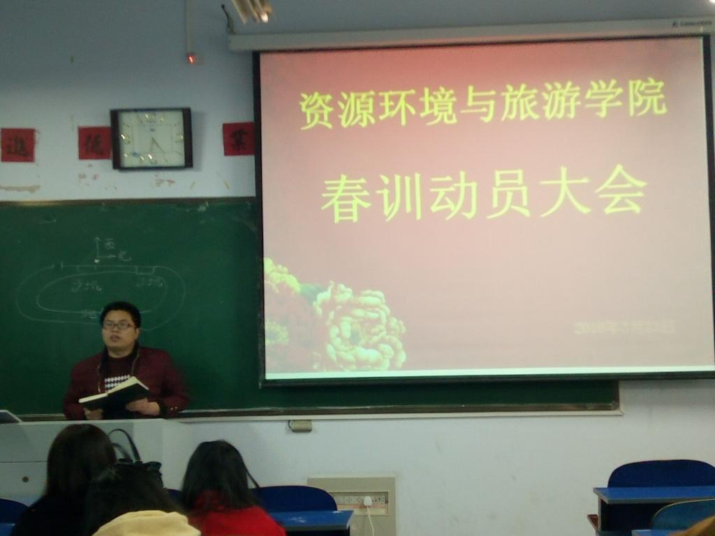 为了在校运动会上更好地展现资环魅力,2016年3月13日晚18时30分资源环境与旅游学院在资环楼102教室开展了春训动员大会。出席此次会议的有12级辅导员老师陈亚、学生会主席石阳、各年级参加春训的人员。