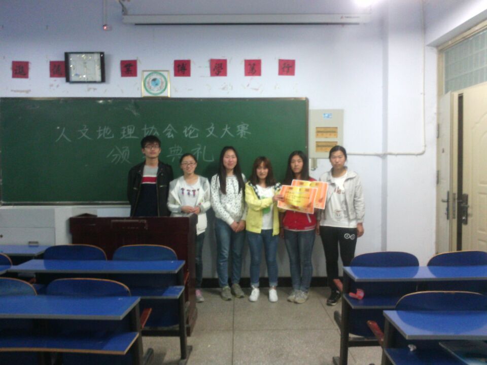 4月28日晚7时在资环楼101教室举办了人文地理协会颁奖仪式。本次比赛从3月27日开始,经过了论文征集、论文评比,直到今天的颁奖环节共经过了32天。颁奖典礼邀请了社联主席王晓宁为获奖者颁奖,获奖选手共有八名,一等奖一名,二等奖二名,三等奖三名,优秀奖二名。