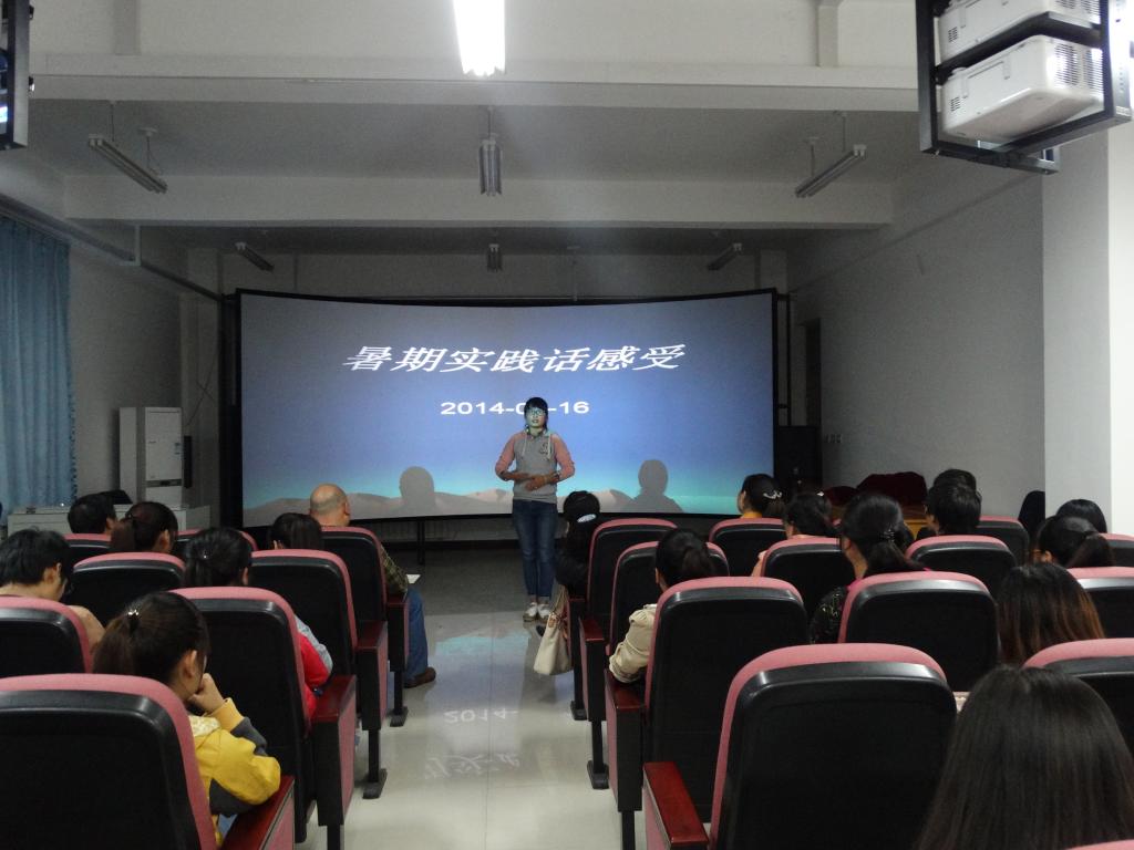 会议由陈亚老师主持,参加暑期实践的4名团队代表和2名个人代表先后上台陈述各自的实践感悟。实践内容种类多样,涵盖有专业类、社会调查类。其中,参加内黄义务支教的学生谈到了团队协作精神,并切身感受到自身知识储备不足,希望今后努力学好文化知识;“万物之源”团队的学生在调查水污染的过程中,亲自动手实践,将理论与实践有机结合,加深了对专业知识的理解;参加个人实践的学生王文静,在小学生辅导班亲自体验到了为人师表的喜悦与不易,并深深为孩子们的纯真打动,她在陈述中说道:“每次给学生改作业,都会情不自禁地写很长的评语,有的老师说没必要那么认真,我想他们永远都不会知道,当你完完全全付出所有并不求回报时,那种感觉是多么满足……”。