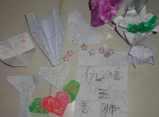 上午10:00,学生们将手中的纸准备好,队员樊慧歌、丁新颖、郭亚莉、郝敏杰、仇晓玉等开始教学生们折纸。学生们将手中的纸跟着队员们的指导而翻动,不一会儿,多种类型的折纸成果就出来了,有百合花、小船、玫瑰花、叠心、小狗、枪、飞机等。看着学生们欢喜的笑脸,队员们都开心的笑了。随着折纸过程的进行,许多学生都想要把手中的折纸送给队员们。其中,张晴小朋友举着手中的玫瑰花对队员樊慧歌说:“老师,我想把这朵花送给你好不好?我回家后也要再折一个送给我妈妈!”樊会歌高兴地拥抱了张晴,队员们看到都开心的笑了。