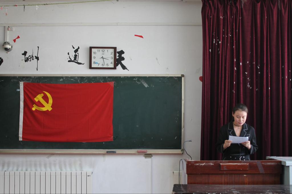 鲜红的党旗,醒目的主题,简而有力地为现场渲染出庄重的气氛,在雄浑庄严的《国际歌》后,宣誓仪式正式开始。首先李晓岩老师宣读了新党员名单,并由老党员依次为新党员佩戴党员徽章。接着李晓岩老师带领新党员们进行了宣誓仪式。现场顿时响起阵阵激昂的宣誓声,每个同学都用发自内心的声音抒发对党忠诚的决心,面对着党旗,大家接受了一次身心的特殊洗礼。之后新党员代表赵芮以及老党员代表李宁做了发言。她们的发言道出了学生党员的心声,表明了党在我心,一起奋进和做好表率的决心。最后陈亚老师代表党委会对大会作了总结,他强调新老党员都要恪守在党旗下的诺言,要时刻严格要求自己,并且要保持共产党员的先进性和先锋模范作用,努力使自己成为一名优秀共产党员。伴随着国歌的响起,本次会议圆满落幕。