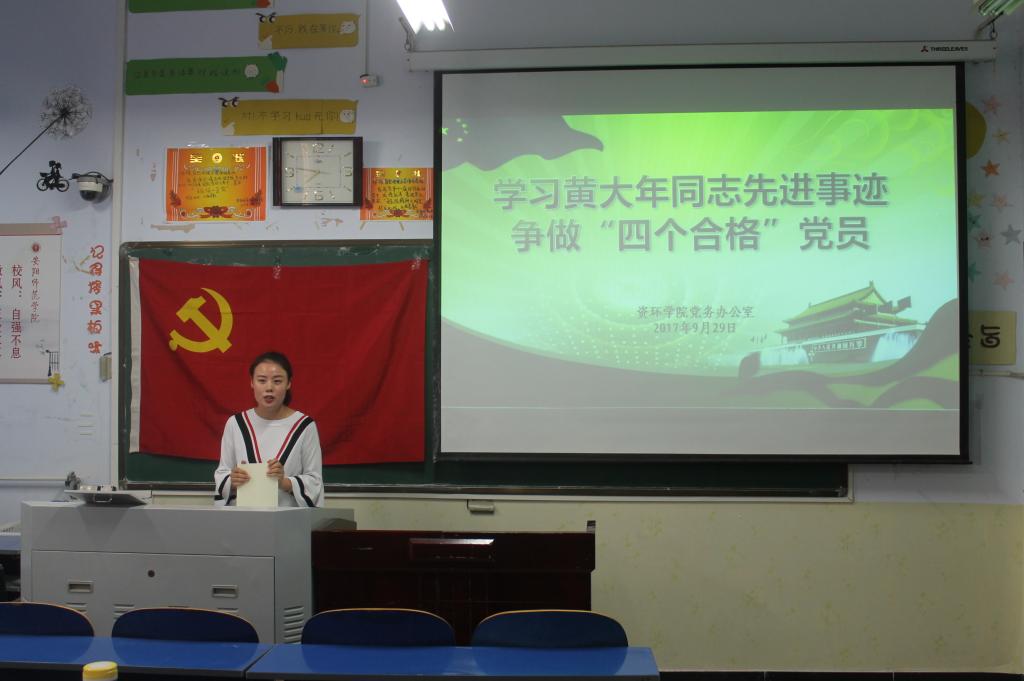 根据安阳师范学院党委关于深入学习黄大年同志先进事迹,推进高校“两学一做”学习教育常态化制度化的通知要求,资环学院于2017年9月30日下午在资环楼102教室召开了全体学生党员大会。大会由学生党建负责老师李晓岩主持,组织全体学生党员学习黄大年同志的先进事迹,争当“四个合格”党员。