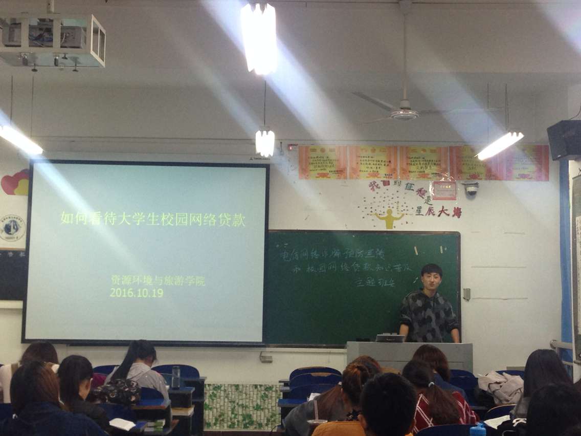 近来大学生被骗的案件层出不穷,为加强资环新生对电信诈骗的应变能力,资环学院地理科学一班于2016年10月20日晚6时30分进行诈骗预防工作,让同学们要对电信诈骗和校园网贷提高警惕。