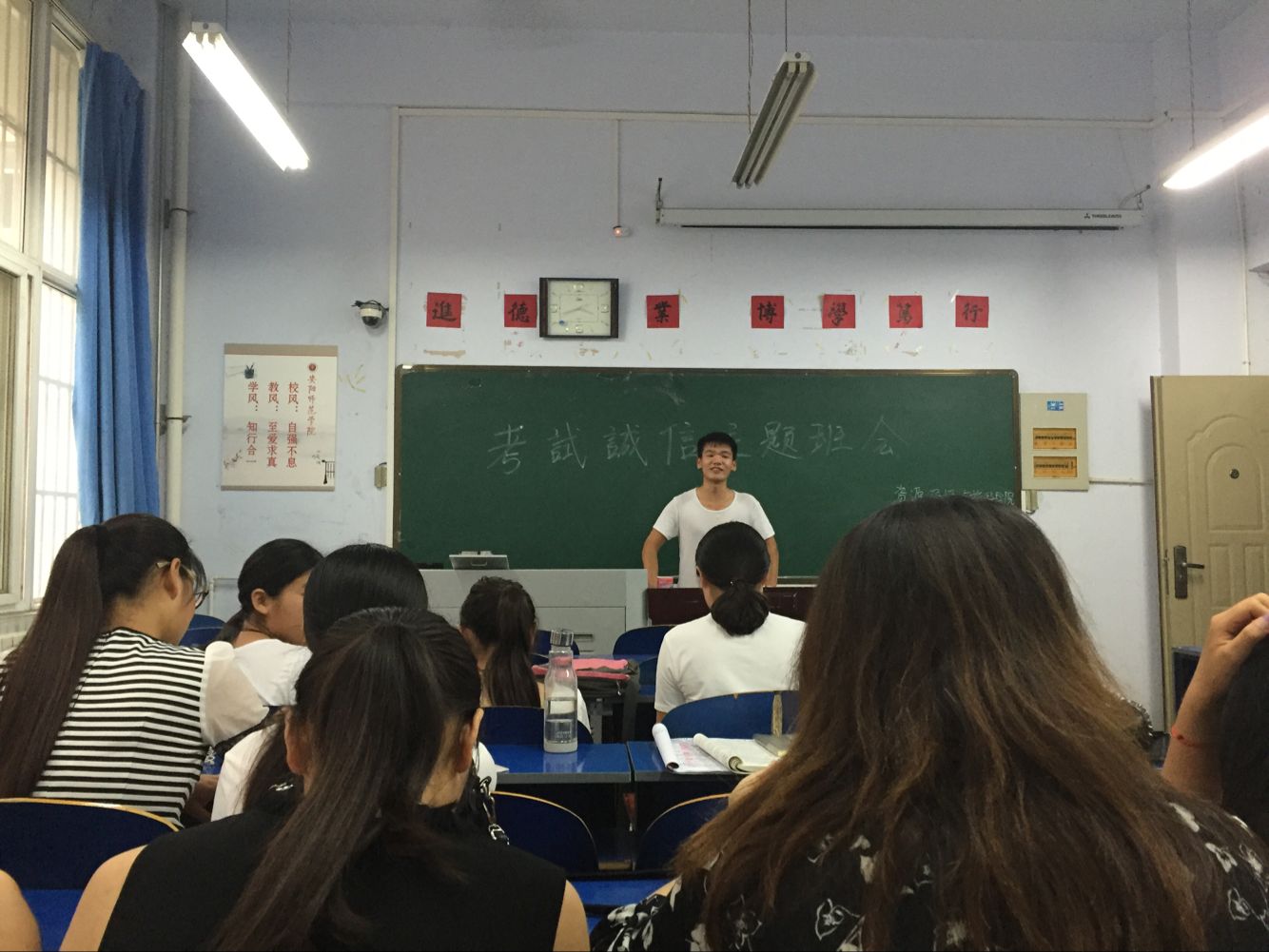 人无信而不立,为维护学风、考风建设,促进班风发展。2016年7月1日上午,资源环境与旅游学院15级旅游管理二班全体成员在资环楼206召开了关于“诚信考试”的班会。为即将到来的期末考试发出诚信的号召。