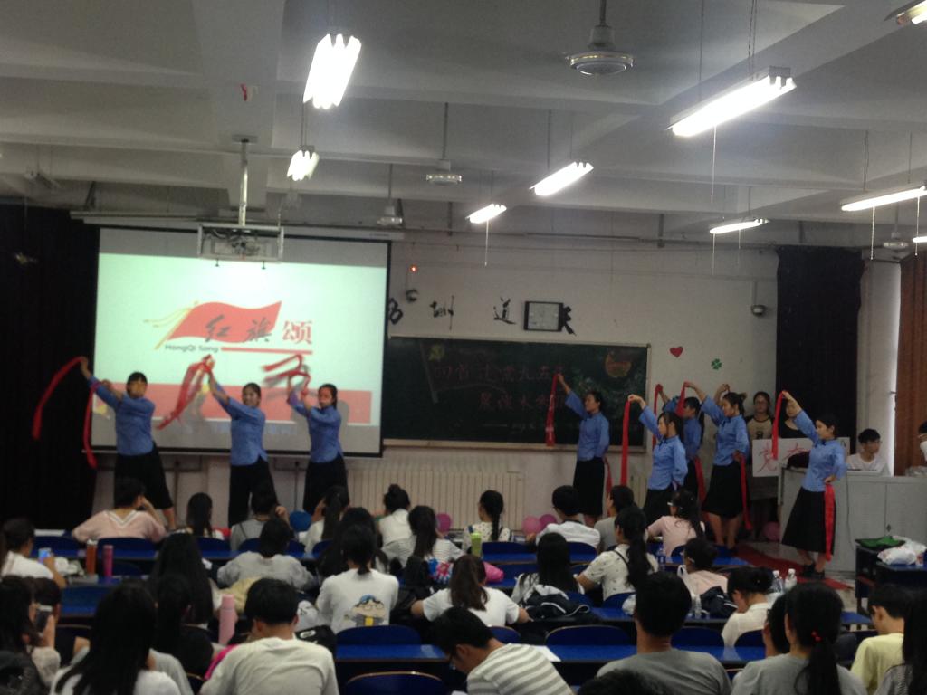 由地科一班带来的开场舞《BangBangBang》点燃了大家的激情,接下来,活动便进入主题,团支书王睿昕介绍了本次活动的流程。本次团日活动以百度搜索为主线,主人公首先搜索了建党80周年的经典节目《红旗颂》,宏伟庄严的歌唱性旋律,表现了中国人民在红旗的指引下英勇顽强,奋发向上的革命气概,热烈讴歌伟大祖国蒸蒸日上的繁荣景象。又搜索了建党85周年的相声《祖国在我心中》,表演者王睿昕和安盼盼滑稽的表演让大家捧腹大笑。接着,建党90周年是由建筑学二班带来的话剧《红色记忆》,一幕幕场景,让人回忆起那个热血澎湃、狂飙突进的时代。建党95年的朗诵节目《中国的希望》,激励同学们努力学习科学文化知识,为中国共产党的发展早点贡献自己的力量。大合唱《没有共产党就没有新中国》宣告着此次团日活动圆满结束。