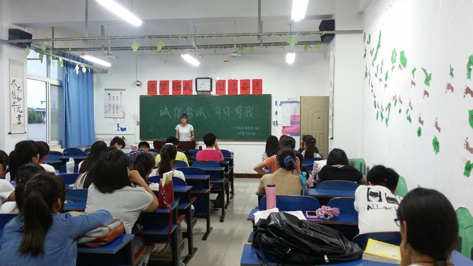 会上,班长李晓玉从考试的重要性到诚信美德的建立,从作弊后果的严重性到实际的事例讲述了诚心考试的重要性,她指出,诚信,不仅是一种品行,更是一种责任;不仅是一种道德,更是一种准则,希望同学们凭自己的真才实学,在考场上发挥出色的水平,以诚信考试为荣。“一次考试,一次检验,这可以让我们看清自己的弱点,促使我们今后更加努力,所以,大家要对自己负责,诚信考试。”14级辅导员王静老师在班会上说道。
