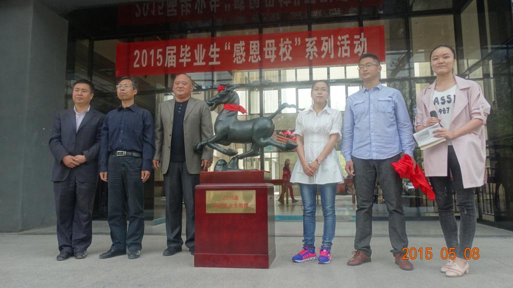 活动开始后,首先,毕业生吕顺昌代表2015届全体毕业生在发言中表达了对学院老师的深深的感谢,并表明捐赠中国旅游标志“马踏飞燕”是2015届全体毕业生的心意。李继文书记在对全体毕业生的致辞中,对不管是读研的学生还是走向工作岗位的学生都致以最美好的祝福。紧接着,韩书清院长、李继文书记、焦士兴院长和学生代表吕顺昌共同为“马踏飞燕”揭幕,红色幕布落下的瞬间,一匹脚踏飞燕,凌空奔腾的骏马映入眼帘,台下瞬间爆发出激烈的掌声。中国旅游标志“马踏飞燕”载满了2015届全体毕业生对母校的深厚情感,同时也象征着资环学院的旅游管理专业,寓意资环学院如奔腾的骏马又快又好地发展。活动最后,毕业生们纷纷捐出自己喜爱的书籍,并在红色条幅上签名写字,有对学弟学妹的殷切期望,也有对老师对同学对自己的祝福,满满的情谊和正能量在堆积的书籍、写满字的条幅上得以传递。