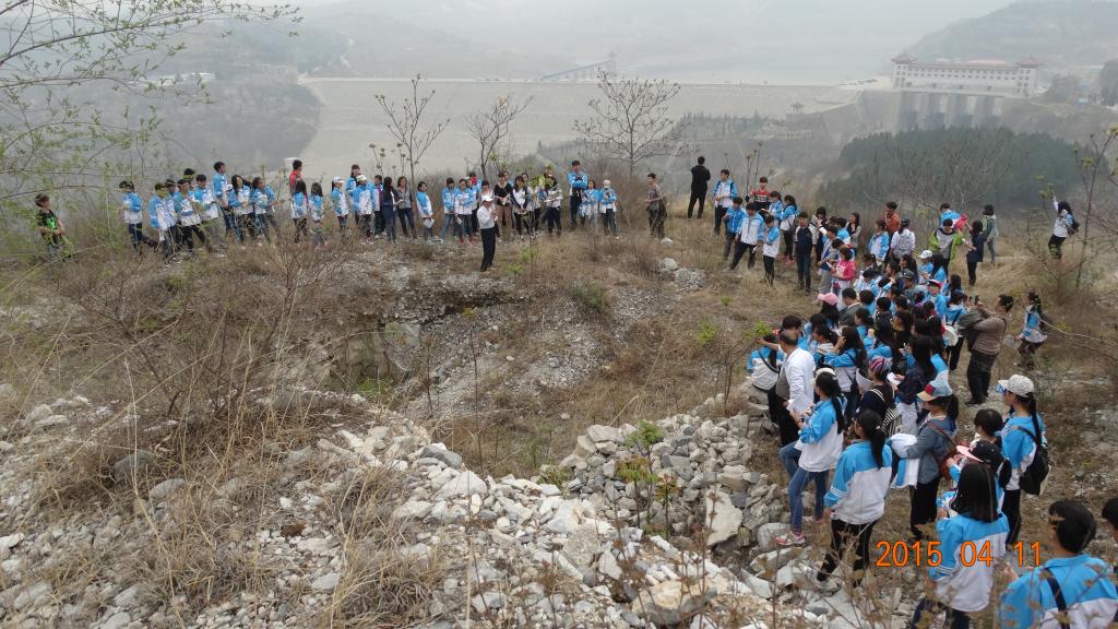 长达两个小时的路程难免使学生出现身体上的不适,尽管如此,大部分学生还是很快就进入了实习状态。众位老师也顾不上做片刻的休息,一下车,便带领学生前往各个观测点。第一观测点是南海庙洹河北岸,张吉献老师声情并茂地为学生介绍了该处沉积岩的各种特点。而后,带着对自然地理的无比好奇和对大自然的无限向往,众师生再次启程前往下一观测点——南海桥北。“同学们能看出对面的地质构造形态是什么吗?与另一山头出露的岩石联系起来可看出为背斜”。紧接着,张院长又对原始人洞穴,及南海水库大坝等做了进一步的介绍。在整个讲解过程中,还时不时有学生大胆提出疑问,并及时做笔记。就这样,众师生本着实习与旅游并行的心态,愉快地结束了一天的野外实习。