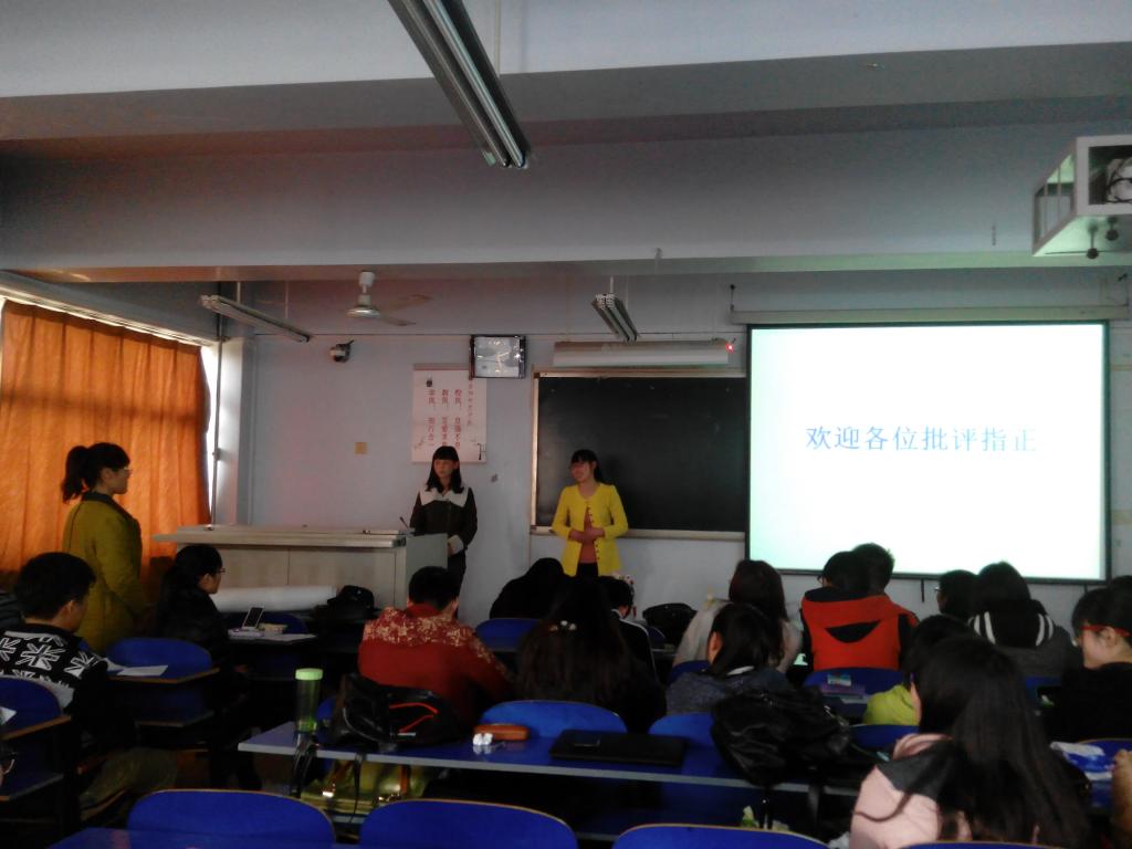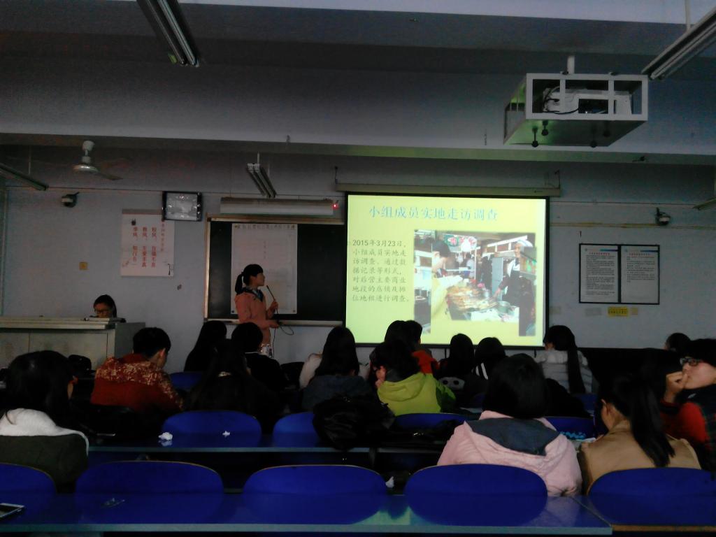 2015年4月10日下午14:30,在高长海老师的号召下,资源环境与旅游学院13级地理科学一班和二班的学生在和展B404教室进行了本专业本学期的第一次人文地理调查汇报,汇报现场还邀请到了四位11级准研究生,他们分别是中国地质大学的李丛、中科院新疆地理所的马天光、福建师范大学的吴小影以及中科院城市所的王菲菲。资环学院13级地理科学专业和人文地理与城乡规划专业的学生聆听了报告会。