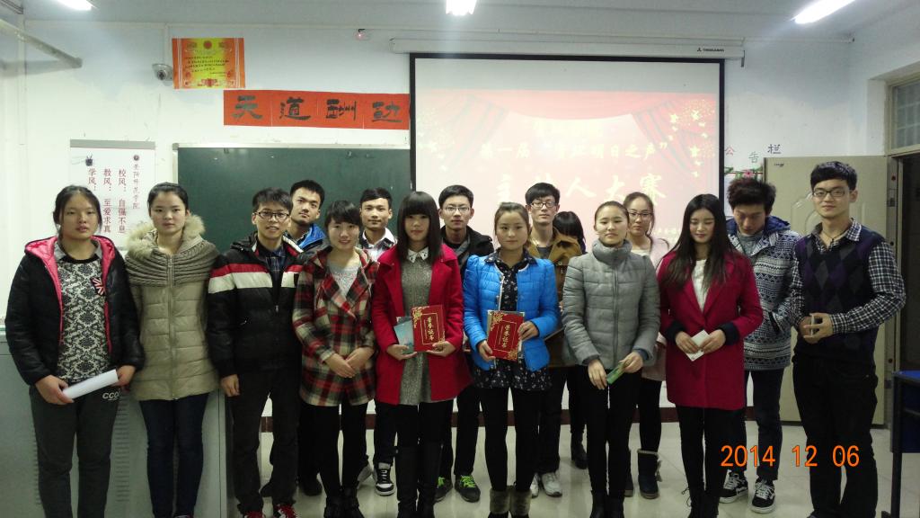 2014年12月6日下午16:00,资源环境与旅游学院天声金语协会在资环楼502教室举办了第一届“资环明日之声”主持人大赛,上演了一场优秀主持人的角逐。参加本次比赛的评委有资源环境与旅游学院党务办公室副主任姜兵,大学生艺术团主持部副部长王美,尤宏伟,校广播站播音员王佳琪。